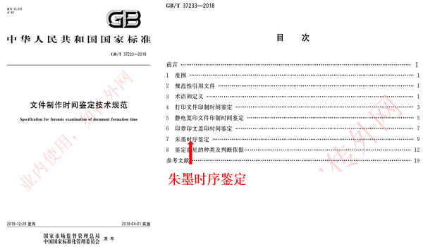 針對朱墨時序檢驗的文書檢驗項目的檢驗標準,司法部于2010年出臺了部頒標準《朱墨時序鑒定規(guī)范》;國家市場監(jiān)督管理總局中國國家標準化管理委員會于2019年4月1日實施的中華人民共和國國家標準《文件制作時間鑒定技術規(guī)范(GB/T37233-2018)》,在這個技術規(guī)范的第七個部分,提出了《朱墨時序鑒定》的具體規(guī)范,同時廢止了司法部于2010年出臺了部頒標準《朱墨時序鑒定規(guī)范》等鑒定規(guī)范。